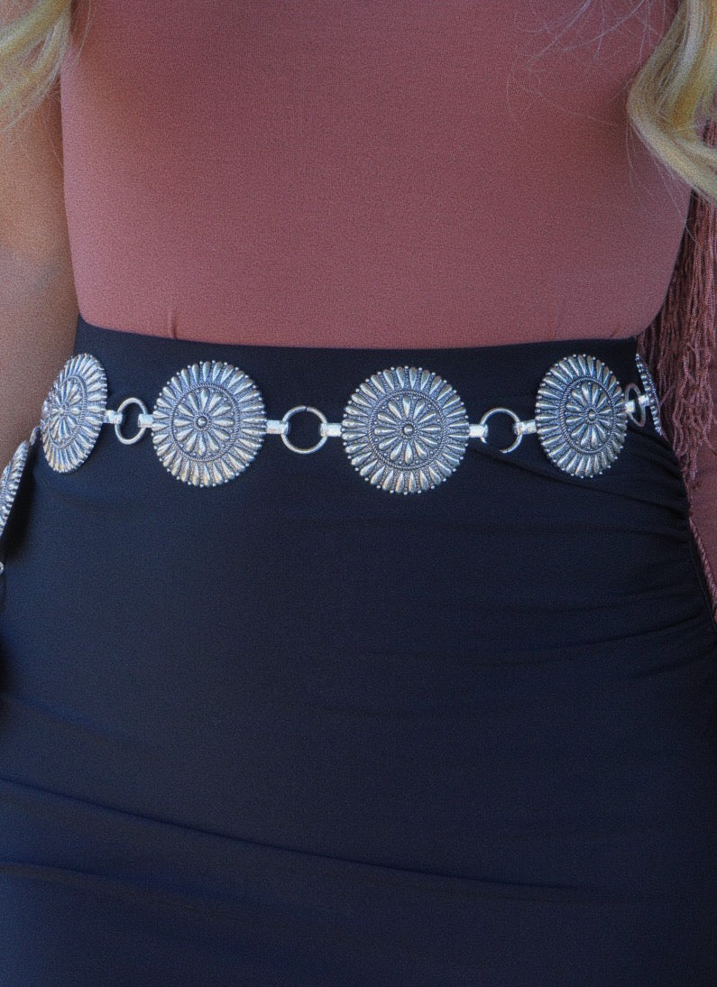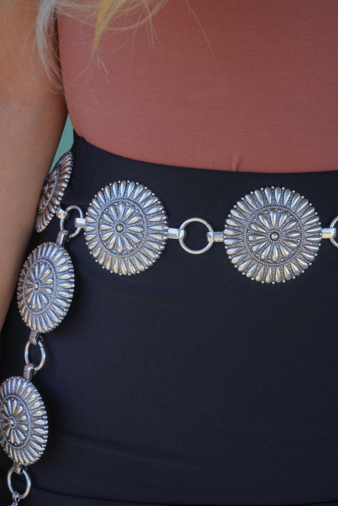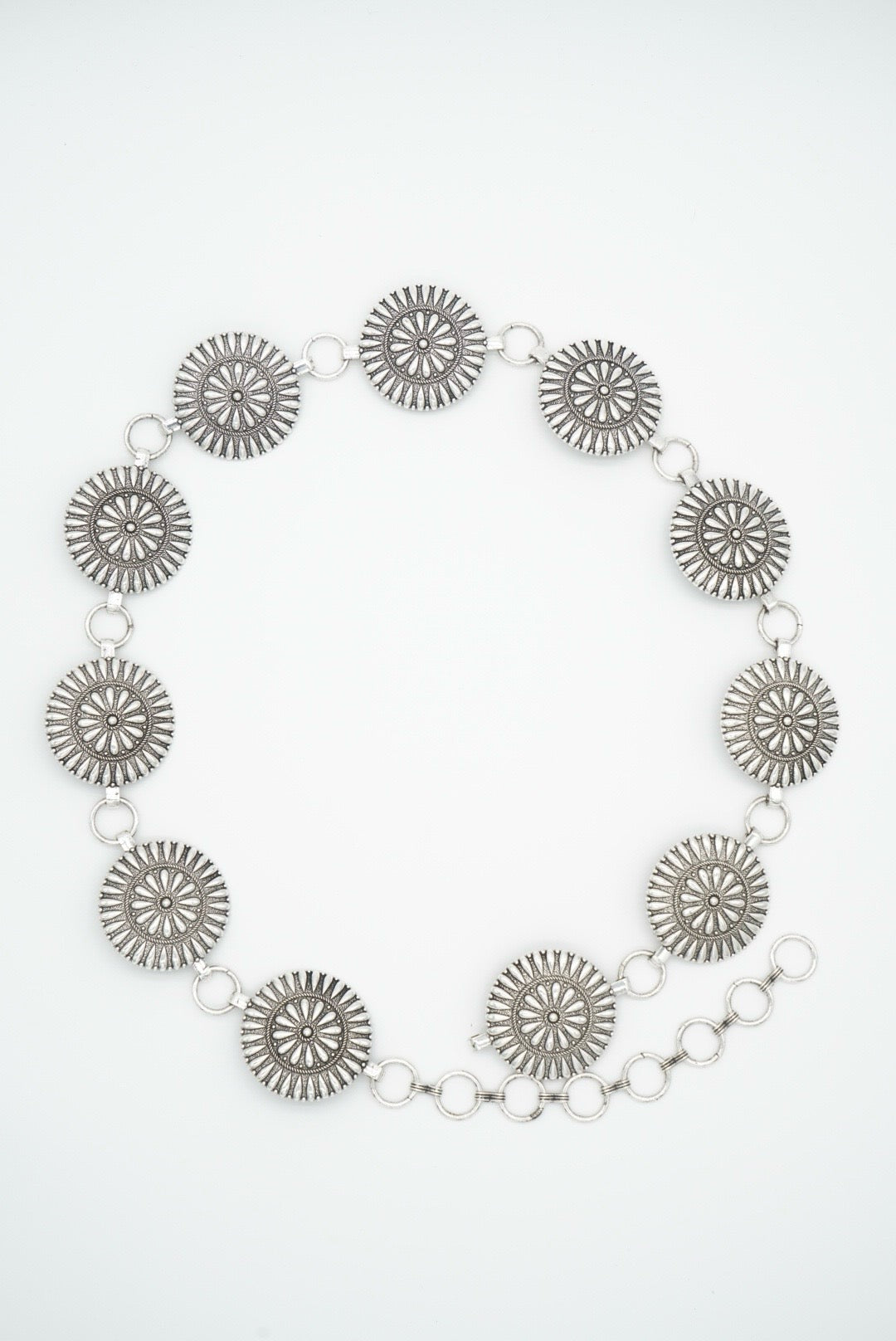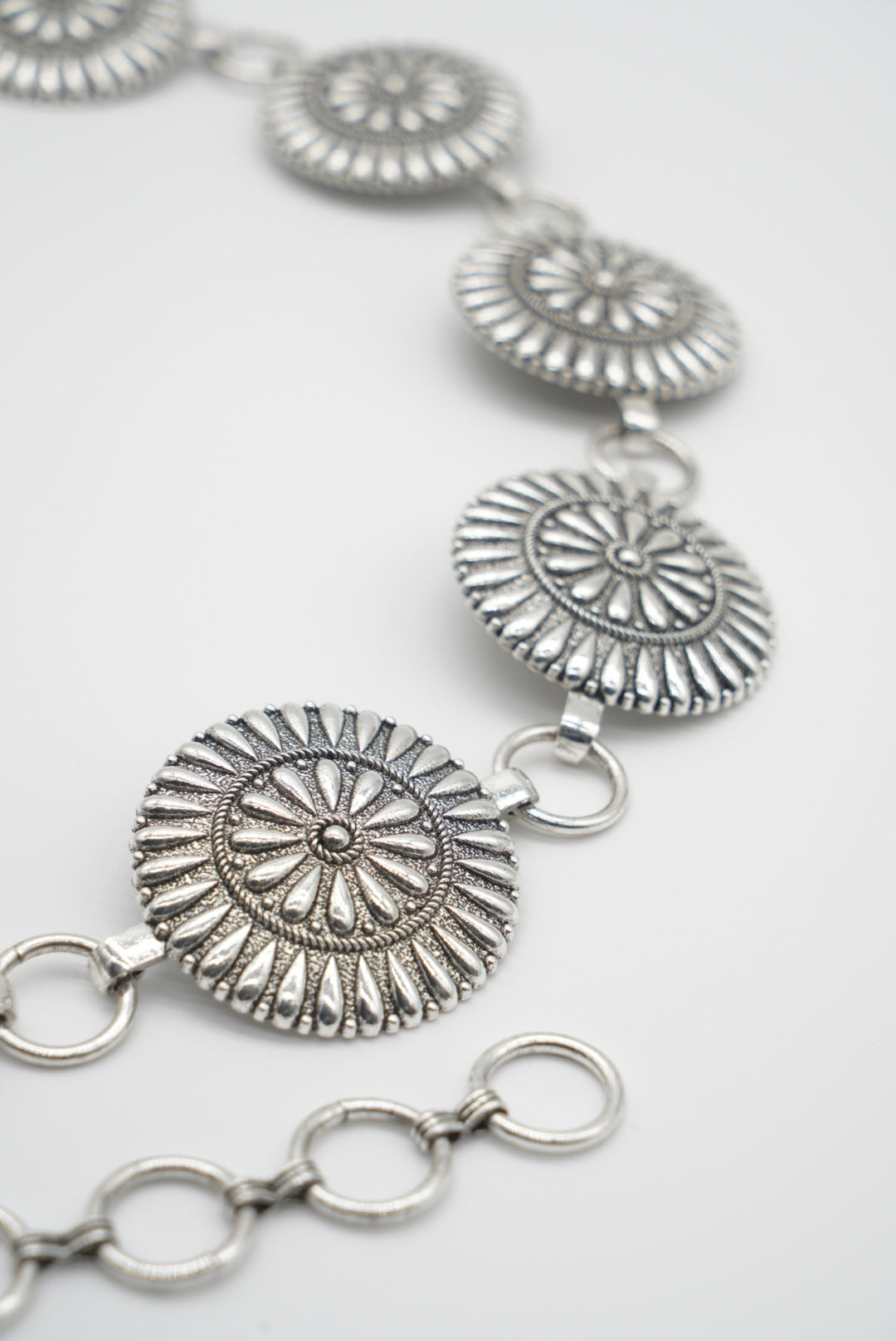 A high-polish chain belt featuring engraved details and a lobster clasp closure.