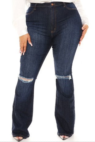 Plus Size Dark Denim Knees Sliced Flare Jeans